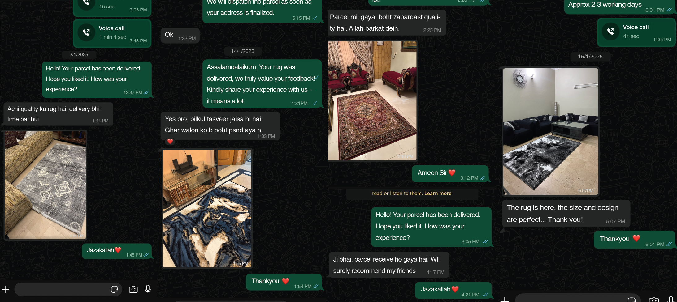 Mene pehle dfa rug order kia ha online, aur 100% worth it! Quality bhi zabardast.